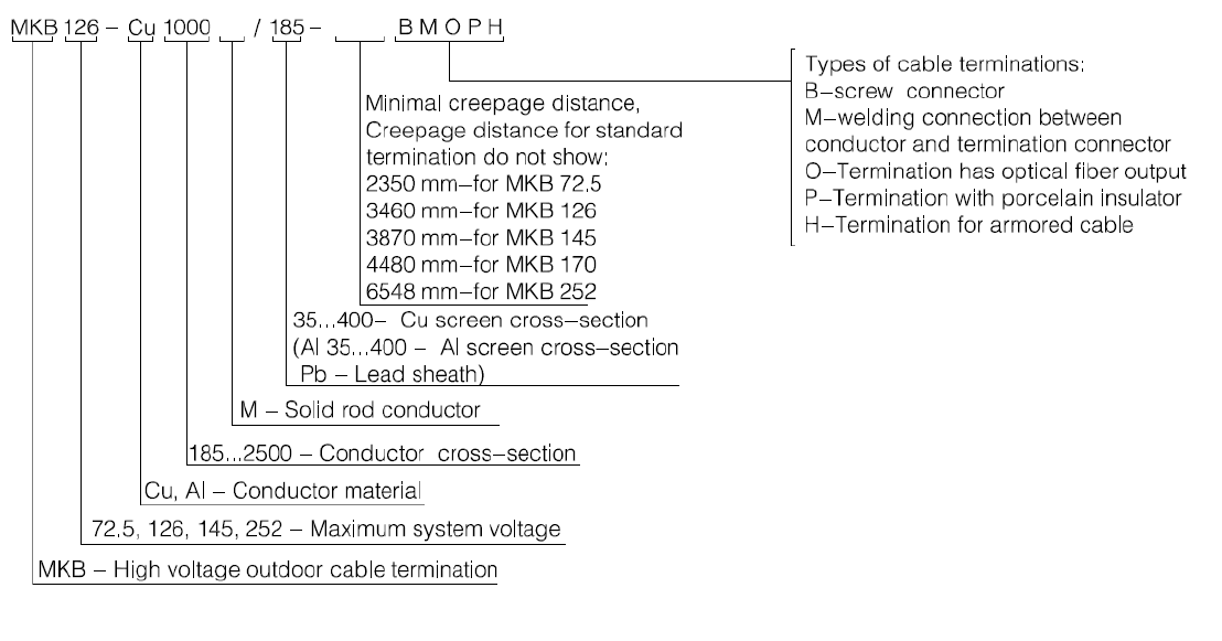 Outdoor termination MKB 126 / 145 / 170 with silicone type insulator uses for the connection of cable line with other elements of power supply systems. Outdoor termination MKВ 126 /145 uses for outdoor and indoor installation, for XLPE cables 64/110 kV with the conductor cross-section up to 2000 mm2.